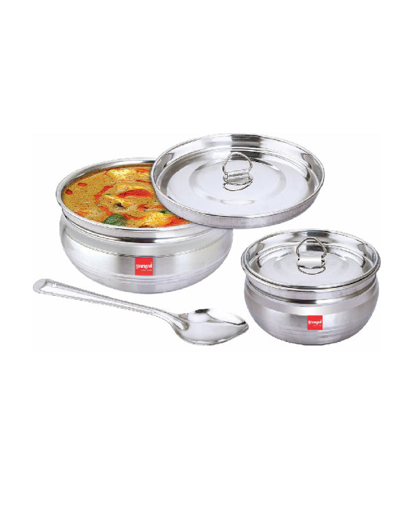This dinner set is made from food grade quality stainless steel which makes it a brilliant product and an ultimate combo. The quality from which the dinner set is made is a premium quality stainless steel that makes it a way healthier life than the regular melamine products. This makes sure that there is no food contamination and the food can be stored in the same containers and can be used to serve as well. Moreover, this kitchen combo set is very size efficient, will fit in your kitchen effortlessly and will save you a lot of space. This combo is a complete value for money as this serving and storage set is a great add on to your kitchen. The high quality stainless steel make the dinner set strong and makes it the best option for meal times at home. You can also give this set to your loved ones as a perfect gifting option on wedding or special occasions.